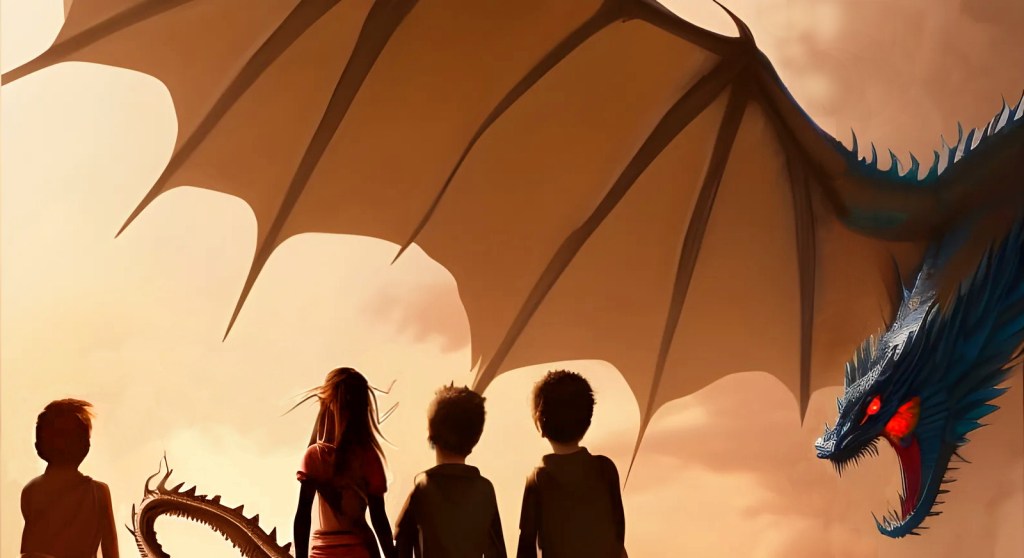 First, from left to right, Toby, Allie, Max, and Grady confront Lux the Silver Dragon in a world before time began in BATTLE BEFORE TIME.